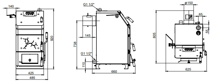 В аппарате предусмотрена возможность установки нагревательного элемента (блока ТЭН). Котёл должен устанавливаться в закрытом помещении, оборудованном приточно-вытяжной вентиляцией. Система вентиляции должна учитывать индивидуальные особенности помещения котельной и обеспечивать нормальную работу аппарата. Главное отличие шуровочный механизм из нержавеющей стали AISI321 для очистки колосников позволяет использовать спекающиеся сорта угля и угли с высокой зольностью