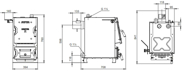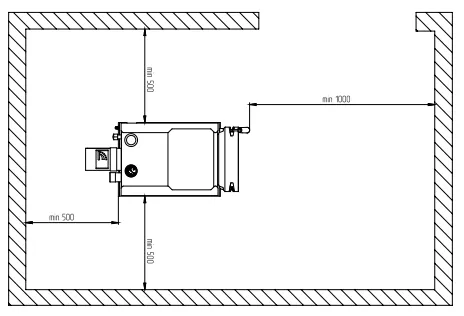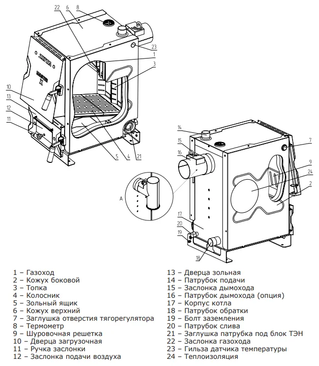 В аппарате предусмотрена возможность установки нагревательного элемента (блока ТЭН). Аппарат должен устанавливаться в закрытом помещении, оборудованном приточно-вытяжной вентиляцией. Система вентиляции должна учитывать индивидуальные особенности помещения котельной и обеспечивать нормальную работу аппарата. Можно установить пеллетную горелку Fox. В случае установки пеллетной горелки ручной котел перейдет в разряд автоматических