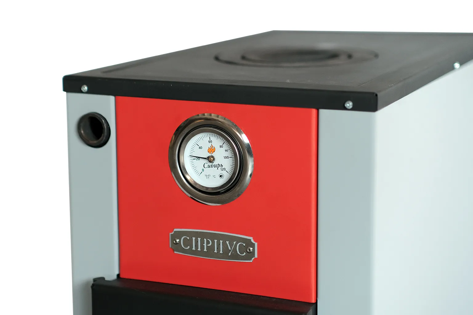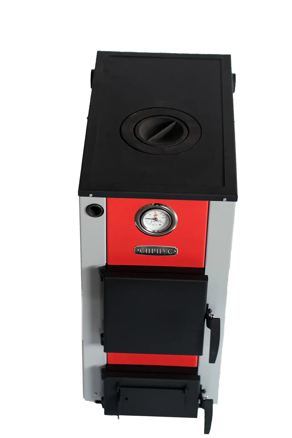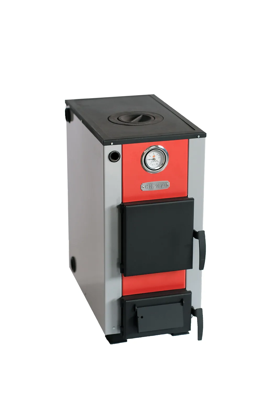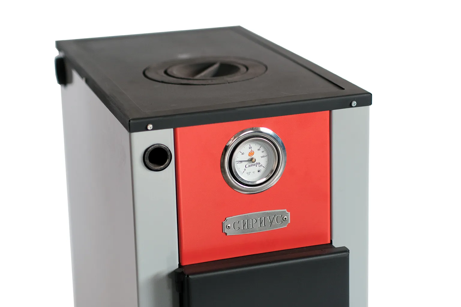Котел серии "Сириус" в модификации 10 кВт отличается высокой производительностью и повышенным КПД полученного за счет внедрения дополнительных теплосъемных элементов, расположенных внутри котла. Стальная варочная плита ограничена снаружи металлическим уголком, обеспечивающим плотное прилегание к поверхности котла и создающее дополнительную эстетику.