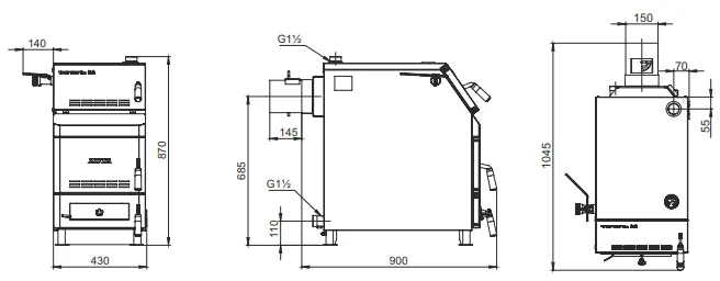 В аппарате предусмотрена возможность установки нагревательного элемента (блока ТЭН). Аппарат должен устанавливаться в закрытом помещении, оборудованном приточно-вытяжной вентиляцией. Система вентиляции должна учитывать индивидуальные особенности помещения котельной и обеспечивать нормальную работу аппарата. До 12 часов беспрерывной работы. Два варианта загрузки топлива. Горизонтальная дверца будет удобна для верхней загрузки угля и доступа к теплообменнику во время чистки котла, а шуровочная дверца расположенная горизонтально подойдёт для загрузки дров.