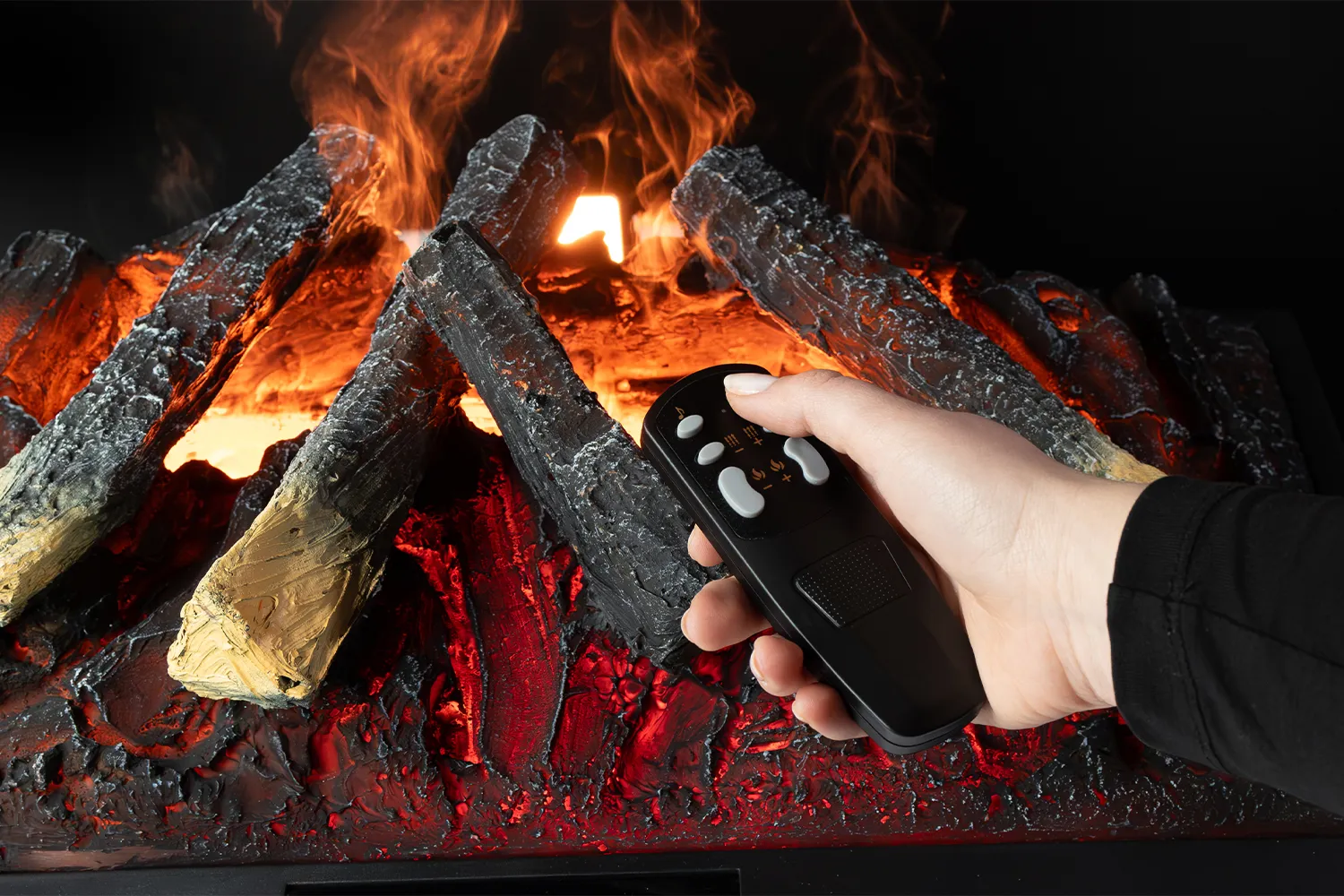 Элементы управления на очаге скрыты под пластиковой панелью для эстетичного внешнего вида и защиты от доступа детей. Также управлять камином можно с помощью удобного пульта ДУ.