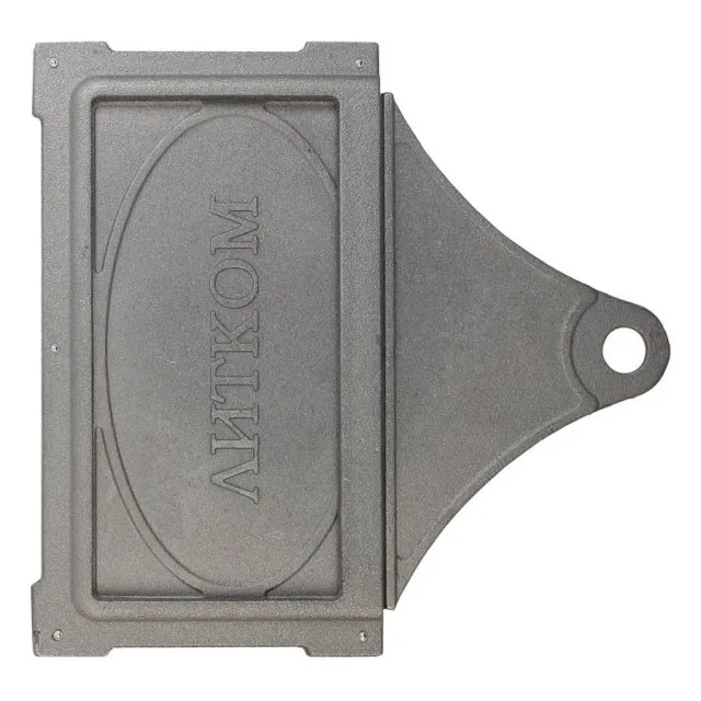 Чугунная задвижка для печей и каминов. Предотвращает выход тепла в трубу. Рамка задвижки состоит из двух половинок, соединённых между собой заклёпками. Задвижка движется по направляющим, что предотвращает её перекос во время открывания и закрывания.
